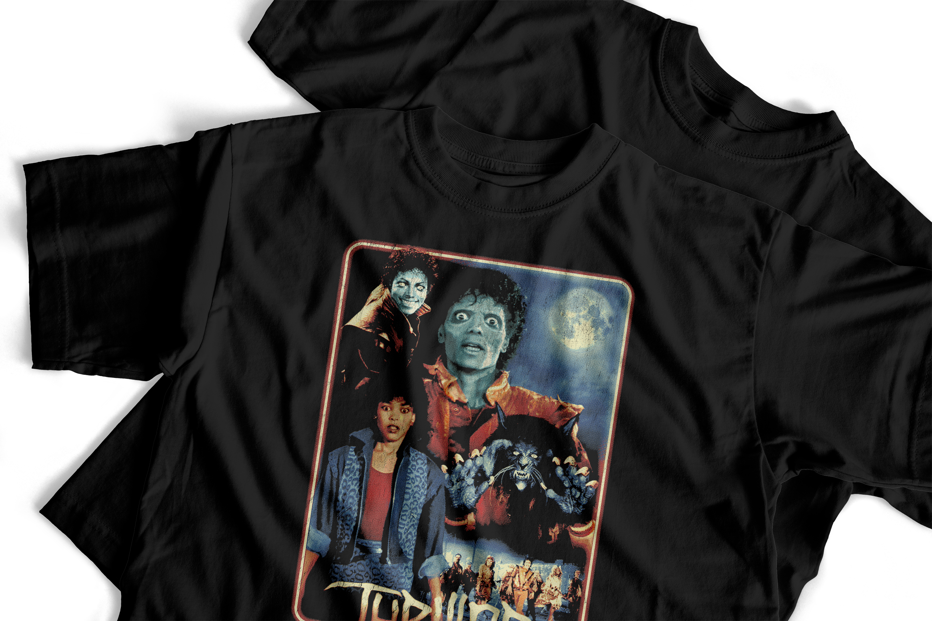 Camiseta inspirada no icônico clipe Thriller de Michael Jackson, recriada em estilo pôster retrô dos anos 80. Visual cinematográfico, cores vintage e aquela energia clássica do terror pop que marcou uma era.