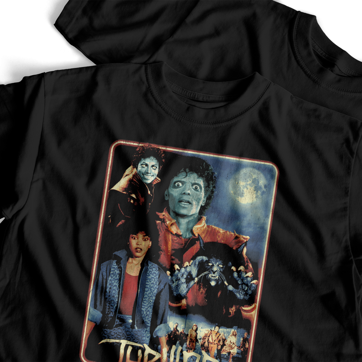 Camiseta inspirada no icônico clipe Thriller de Michael Jackson, recriada em estilo pôster retrô dos anos 80. Visual cinematográfico, cores vintage e aquela energia clássica do terror pop que marcou uma era.